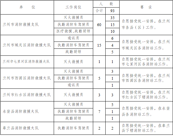 (三)工作地点:兰州市消防救援支队负责招聘的60人,参加入职岗前教育培训并通过考核后,根据工作需要,分配到兰州市各区(县)下辖的消防救援站工作。